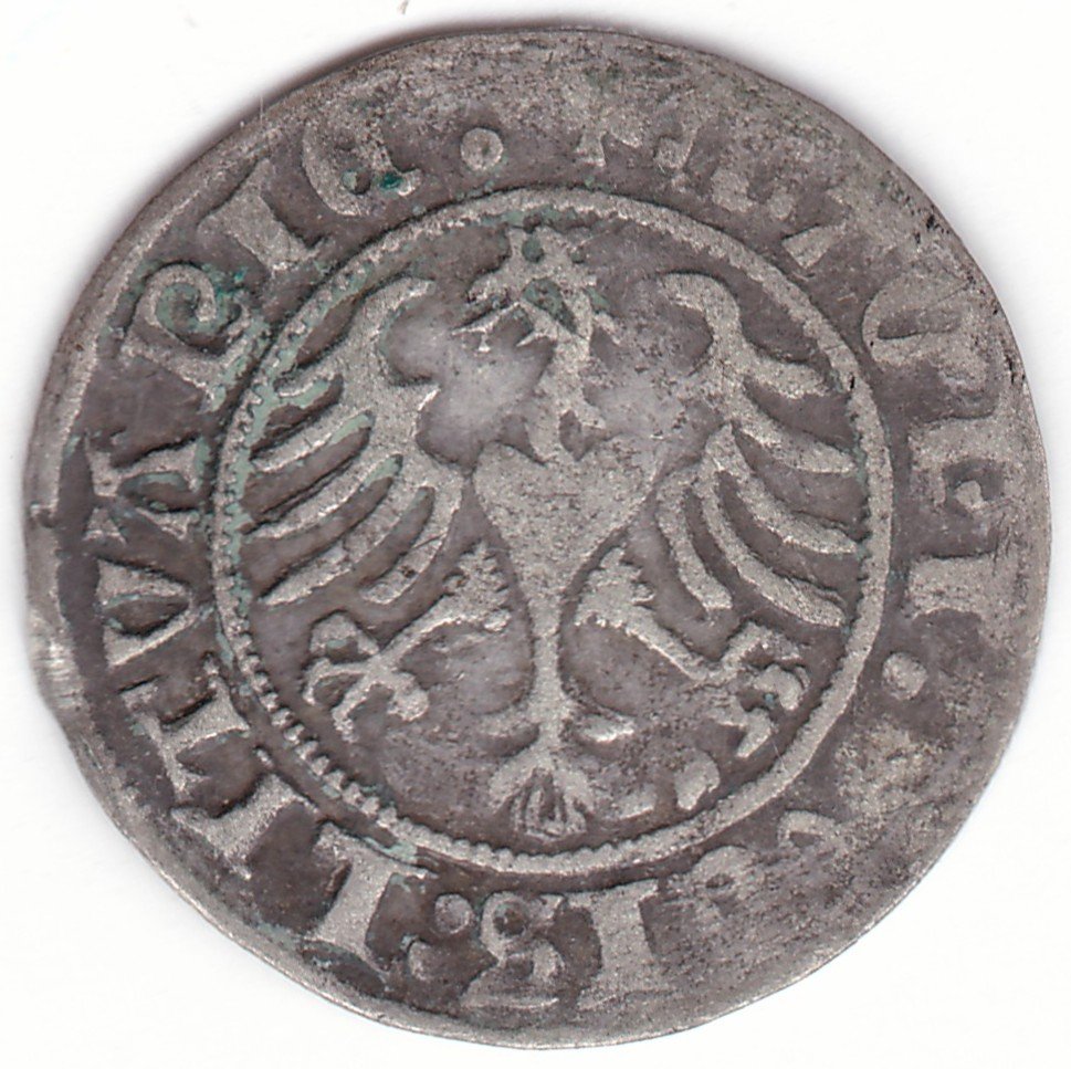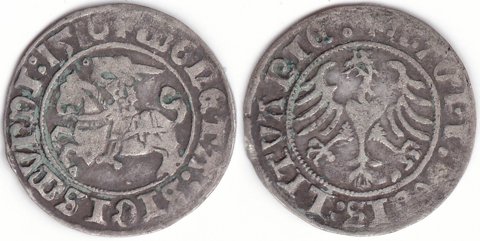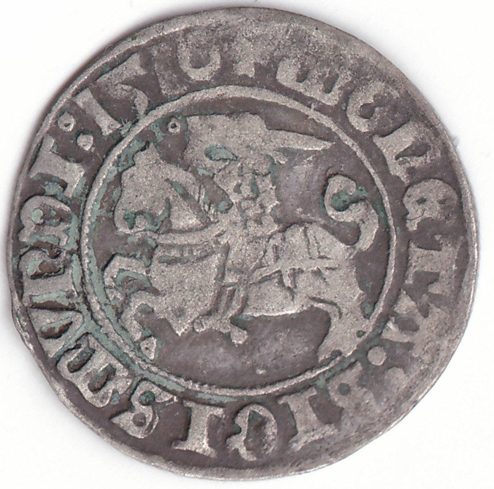 Žygimanto Senojo lietuviškas pusgrašis, 1510 m., 3-A Vytis ir 3 Erelis pagal mūsų knygą. H36 G2. Ženklas po Vyčiu, Keturi ratukai reverso legendos pabaigoje. Vilniaus kalykla, sidabras 375.