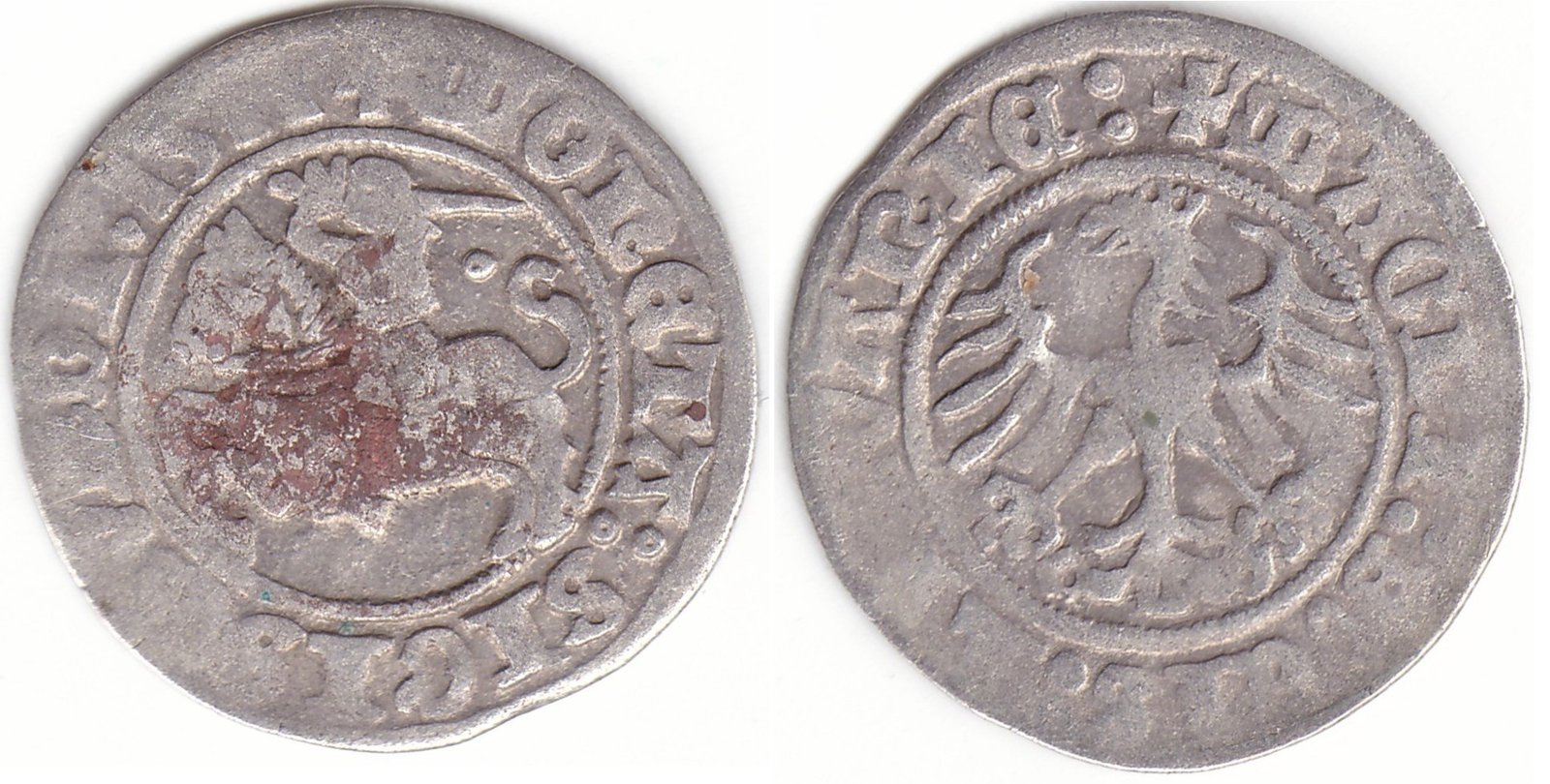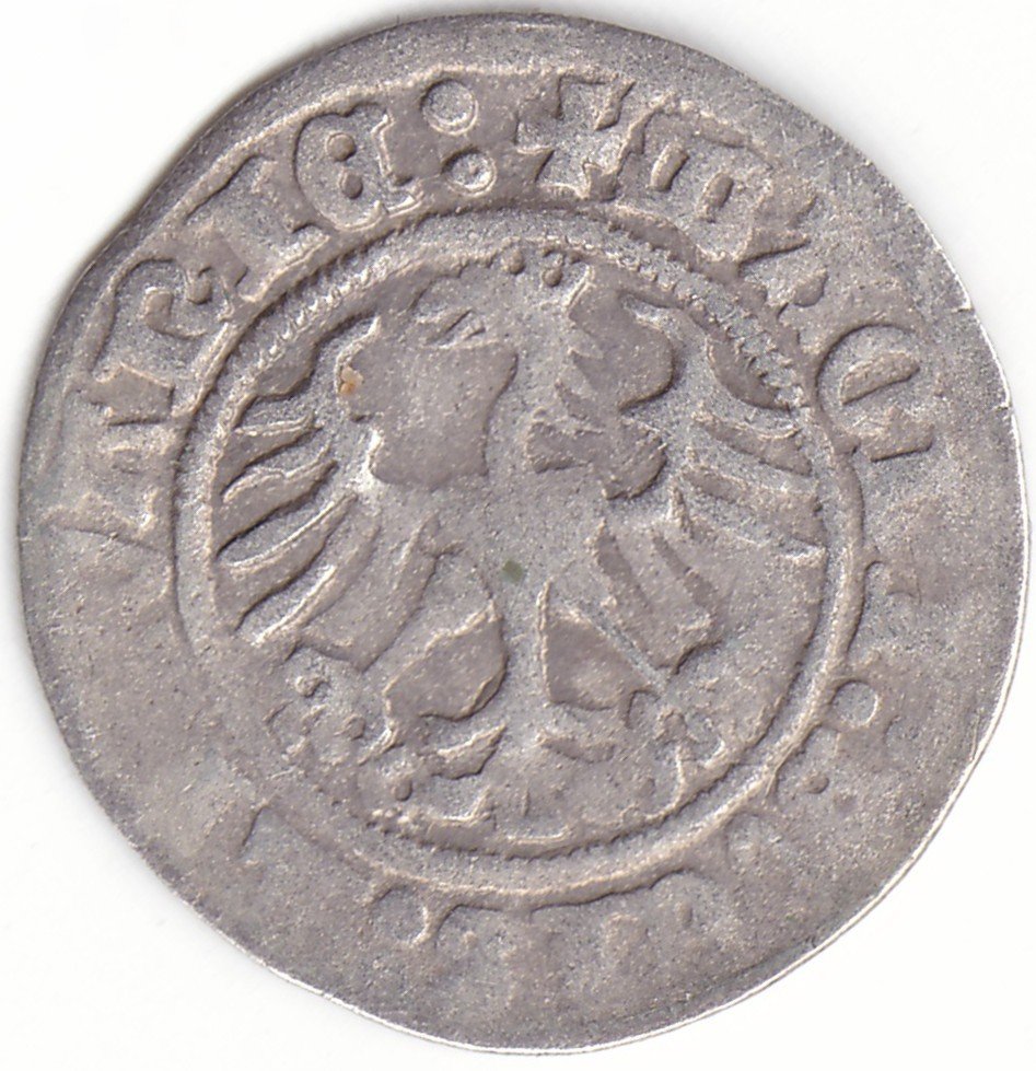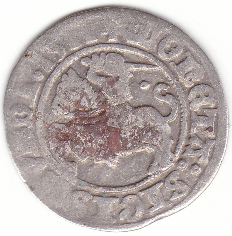 Žygimanto Senojo lietuviškas pusgrašis, 1511 m., 3 Vytis ir 3 Erelis pagal mūsų knygą. H39 Q. Ratukas virš Vyčio. Vilniaus kalykla, sidabras 375.