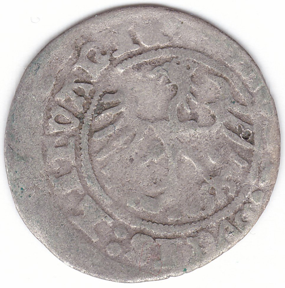 Žygimanto Senojo lietuviškas pusgrašis, 1512 m., 3 Vytis ir 3 Erelis pagal mūsų knygą. Ratukas po Vyčiu. H40 BC. Dvitaškis po LITVANIE. Vilniaus kalykla, sidabras 375.