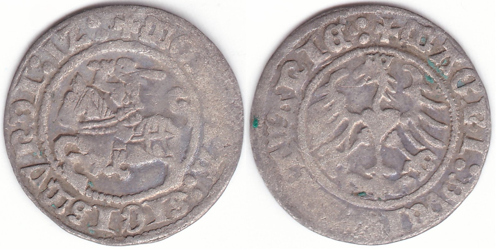 Žygimanto Senojo lietuviškas pusgrašis, 1512 m., 3 Vytis ir 3 Erelis pagal mūsų knygą. H40 AO1. Trys taškai reverso legendos pabaigoje. Vilniaus kalykla, sidabras 375.