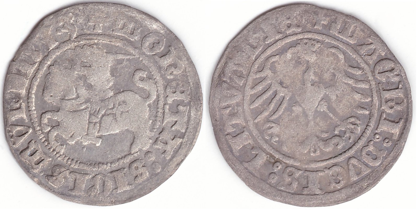 Žygimanto Senojo lietuviškas pusgrašis, 1513 m., 3 Vytis ir 3 Erelis pagal mūsų knygą. H41 J. Taisymas valdovo varde ir datoje. Vilniaus kalykla, sidabras 375.