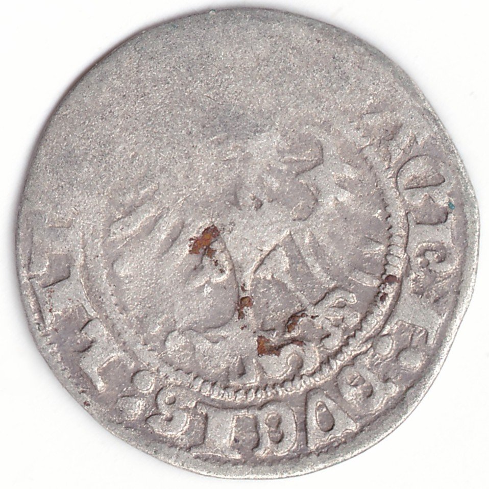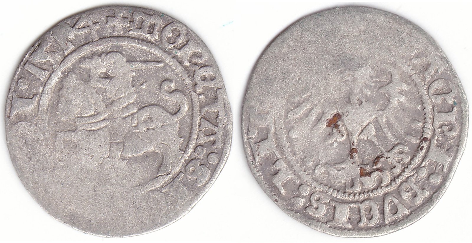 Žygimanto Senojo lietuviškas pusgrašis, 1514 m., 3 Vytis ir 3 Erelis pagal mūsų knygą. H43 A4. Antras vienetas datoje suteptas. Taškas virš Vyčio. Vilniaus kalykla, sidabras 375.