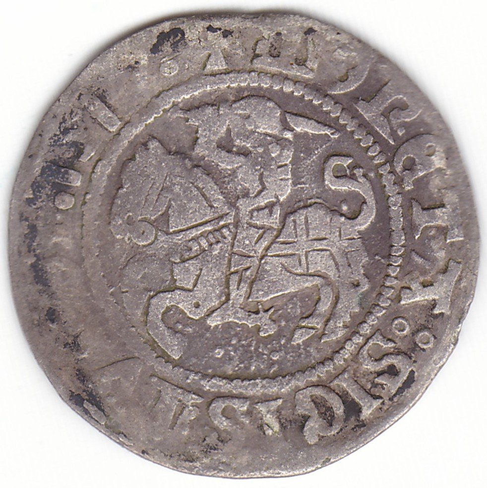Žygimanto Senojo lietuviškas pusgrašis, 1517 m., 4 Vytis ir 3 Erelis pagal mūsų knygą. H47 C. Vienas ratukas reverso legendos pabaigoje. Vilniaus kalykla, sidabras 375.