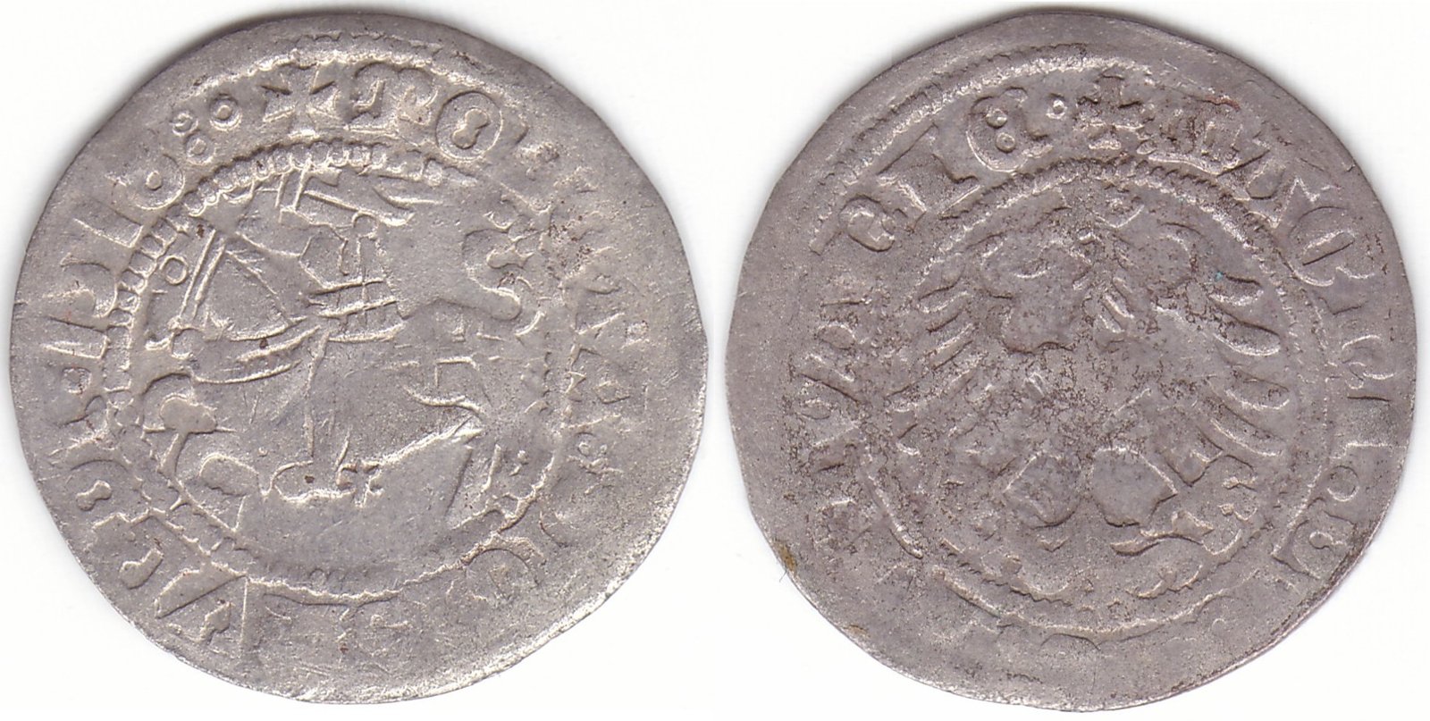 Žygimanto Senojo lietuviškas pusgrašis, 1518 m., 7 Vytis ir 3 Erelis pagal mūsų knygą. H55 L. Trys taškai po datos. Taškas reverso legendos pabaigoje. Vilniaus kalykla, sidabras 375.