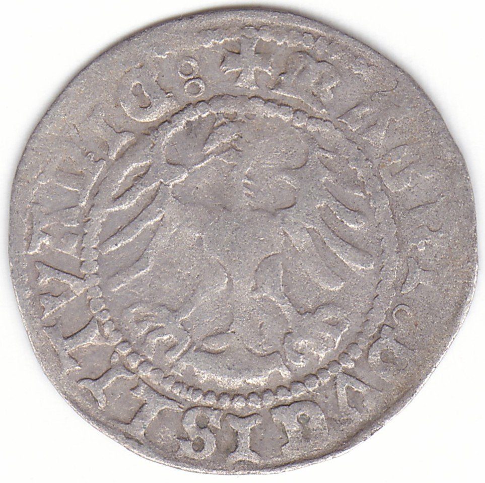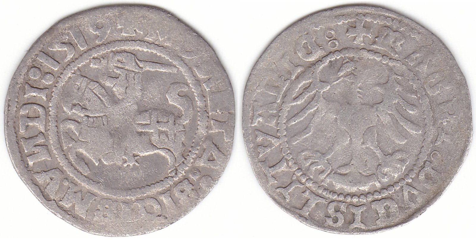 Žygimanto Senojo lietuviškas pusgrašis, 1519 m., mišrus tipas: 8 Vytis (renesansinė averso legenda) ir 6-A Erelis (gotikinė reverso legenda) pagal mūsų knygą. H60 A. Averso legendoje N veidrodinės. valdovo varde taškas po M. Vilniaus kalykla, sidabras 375.