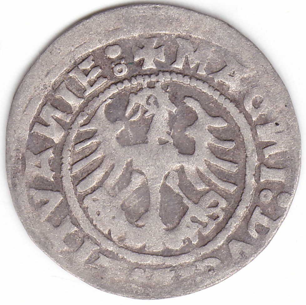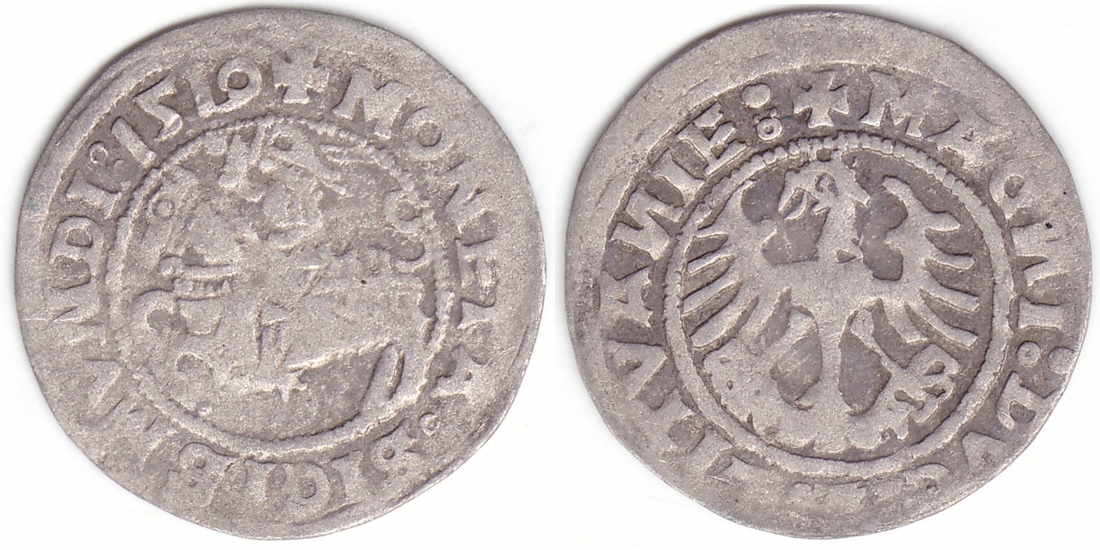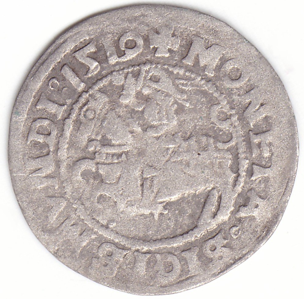 Žygimanto Senojo lietuviškas pusgrašis, 1519 m., 7 Vytis ir 7 Erelis pagal mūsų knygą. H62 A1. Reverse N raidės veidrodinės. Vilniaus kalykla, sidabras 375.