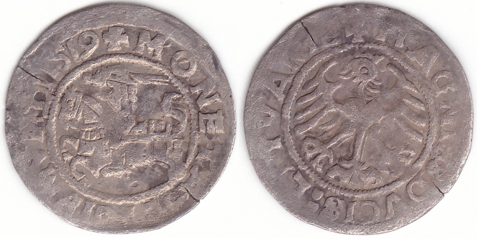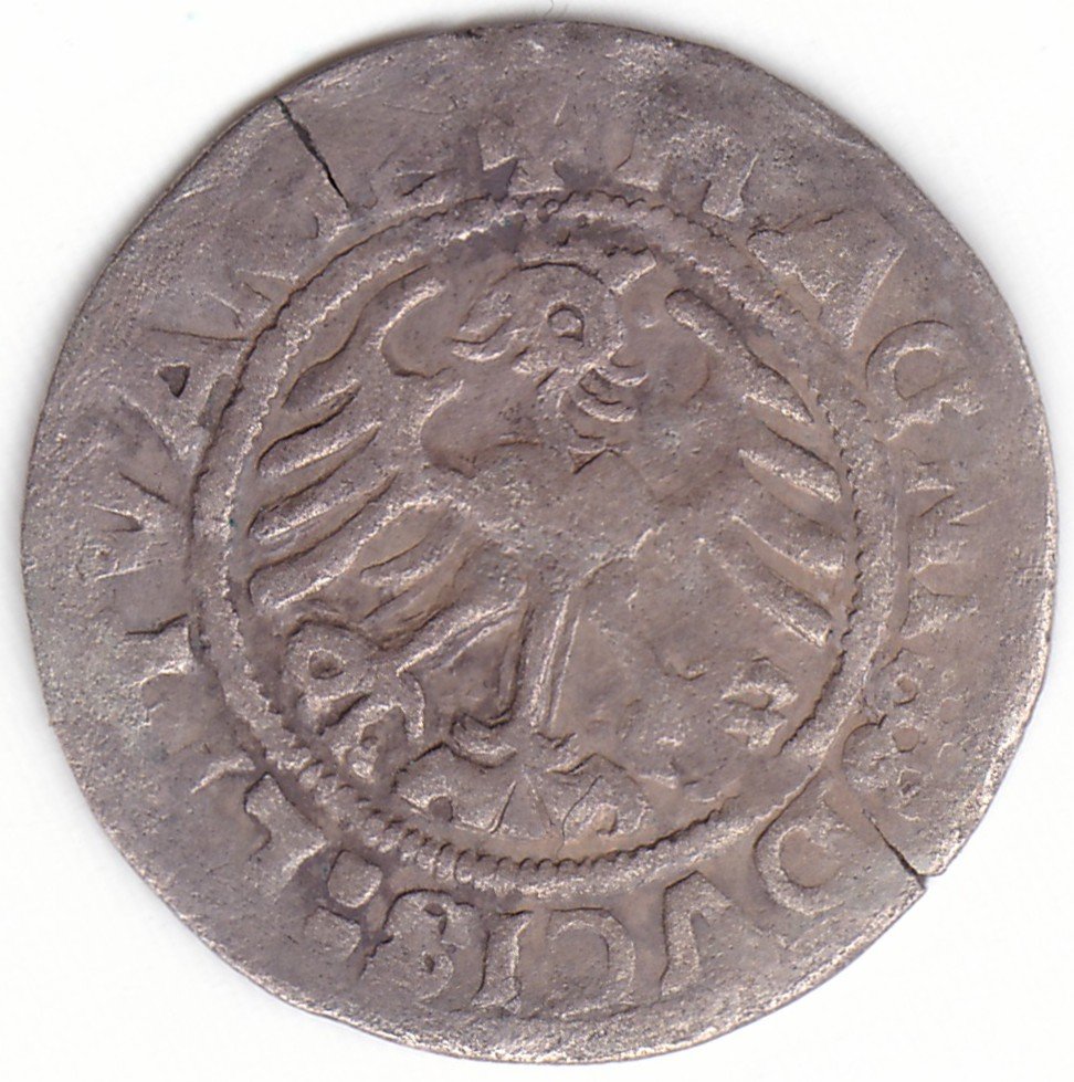 Žygimanto Senojo lietuviškas pusgrašis, 1519 m., 8 Vytis ir 9 Erelis pagal mūsų knygą. H70 A. Valdovo varde raidė N veidrodinė. Nėra interpunkcijos prieš datą. Penkių ratukų interpunkcija po MAGNI. Vilniaus kalykla, sidabras 375.