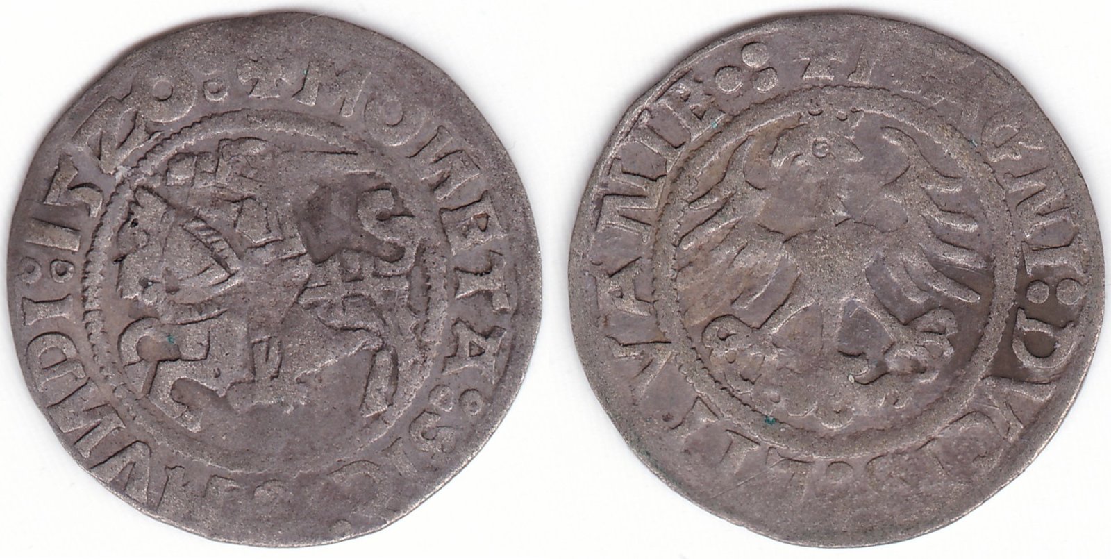 Žygimanto Senojo lietuviškas pusgrašis, 1520 m., 7 Vytis ir 12 Erelis pagal mūsų knygą. H75 P2. Ir averso ir reverso legendoje raidės N veidrodinės. Taisytas dvejetas datoje, reverso legendos pabaigoje trys taškai. Vilniaus kalykla, sidabras 375.