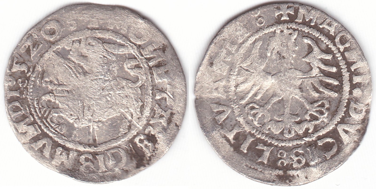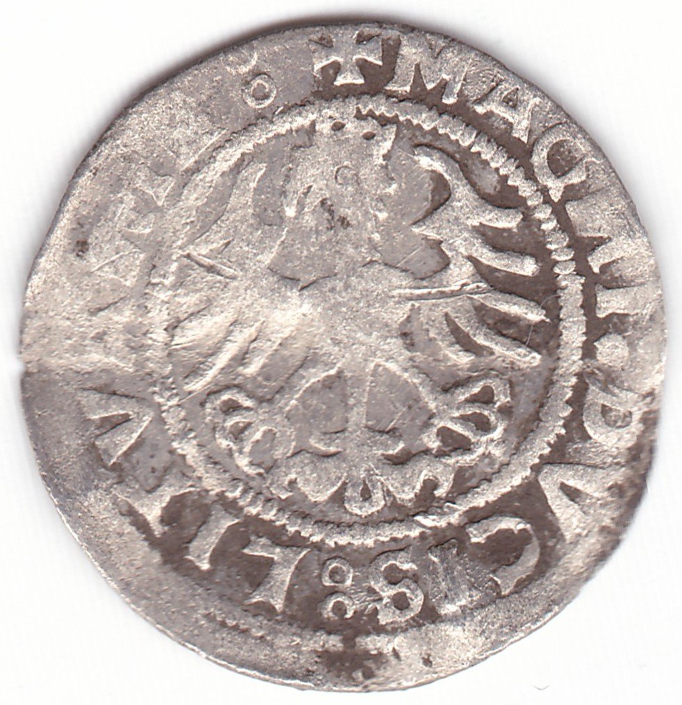Žygimanto Senojo lietuviškas pusgrašis, 1520 m., 7 Vytis ir 12 Erelis pagal mūsų knygą. H75 N. Ir averso ir reverso legendoje raidės N veidrodinės. Klaida datoje 5Z0. Vilniaus kalykla, sidabras 375.