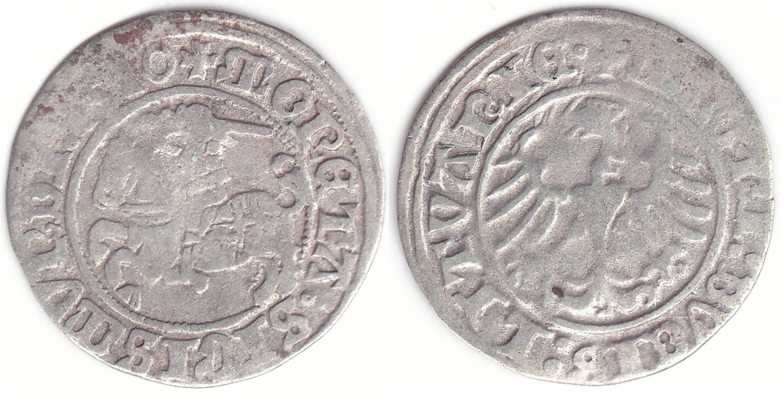 Žygimanto Senojo lietuviškas pusgrašis, 1510 m., 3 Vytis ir 3 Erelis pagal mūsų knygą. H38 E1. Vienas ratukas reverso legendos pabaigoje.  Vilniaus kalykla, sidabras 375.